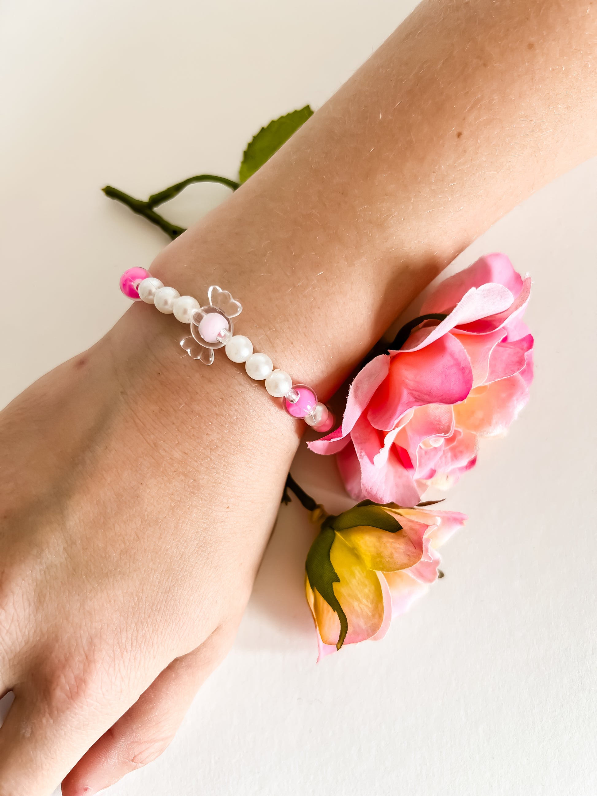 Deze speelse armband is een echte traktatie voor je pols! Gemaakt van glanzende witte parelmoerkralen, gecombineerd met licht- en felroze kralen voor een vrolijke, zomerse uitstraling. Het doorzichtige snoep-bedeltje met een zachte roze glans maakt deze cutie helemaal af. Perfect voor een vrolijke look met een zoete knipoog. Add a pop of candy cuteness to your outfit, girl! 🍭💖✨